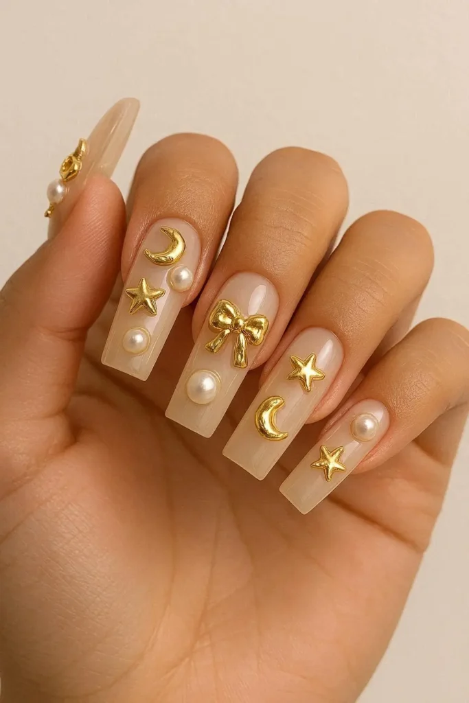 Sculptured acrylic nails dressed with tiny 3D gold charms, stars, moons, pearls, and bows. Each nail becomes a tiny curated display. These are the kind of glam nail ideas that stop people mid-sentence and make them ask who does your nails.