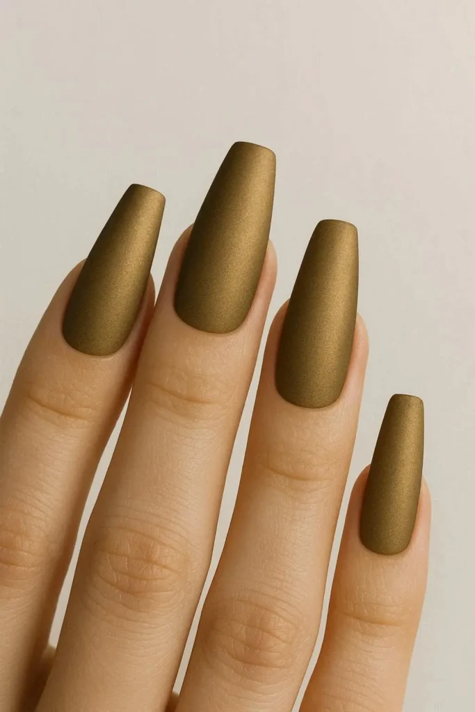 Long coffin-shaped nails in a rich, slightly muted antique gold, not too bright, not too dark. It has a vintage glamour that feels very old-money and very now. Layer a matte top coat over it to deepen the effect.