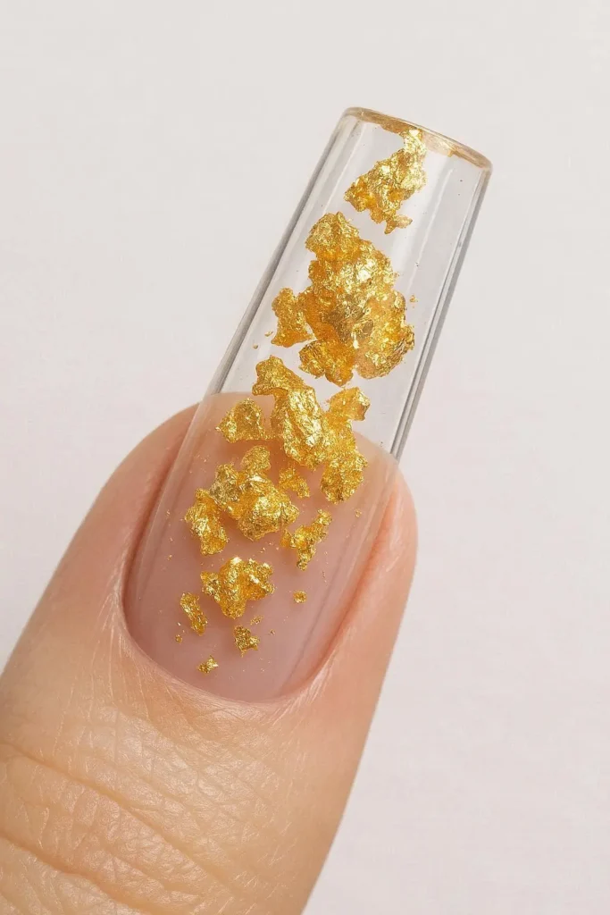 Gold flakes sealed inside a crystal-clear acrylic extension, suspended mid-nail like tiny pieces of treasure. The effect is three-dimensional, sculptural, and breathtaking. A truly showstopping finish to our ultimate gold nail ideas list.