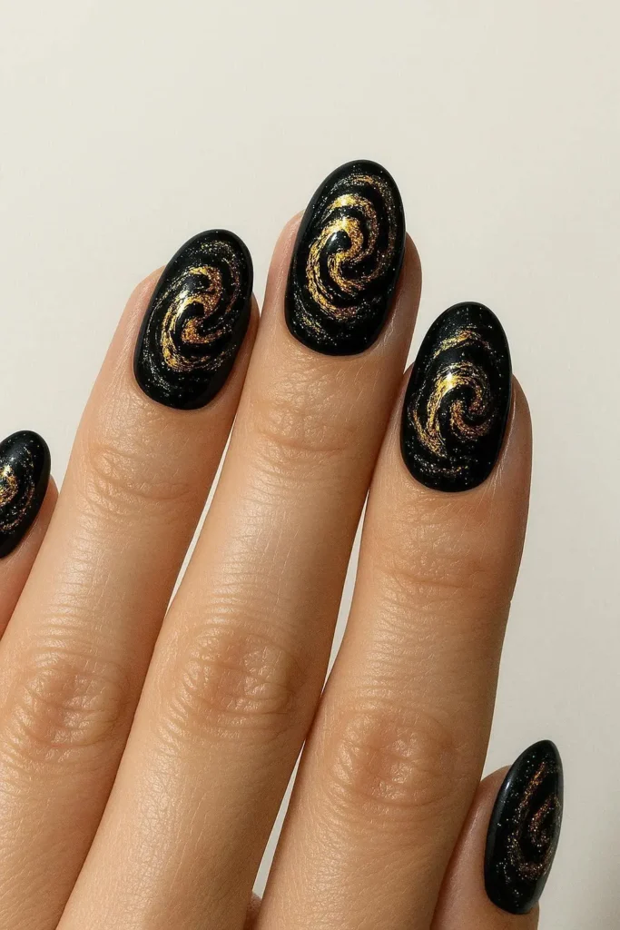 Holographic gold foil twisted and pressed into swirling galaxy-like formations on a black or navy base. Each nail looks like a tiny cosmos captured in lacquer. Dramatic, artistic, and unlike anything else in the world of gold nail ideas.