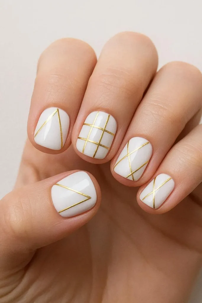Thin gold lines forming triangles, grids, or abstract shapes on a clean white base. Proof that short nails can carry bold, graphic gold nail ideas with total confidence. Minimal effort, maximum sophistication.