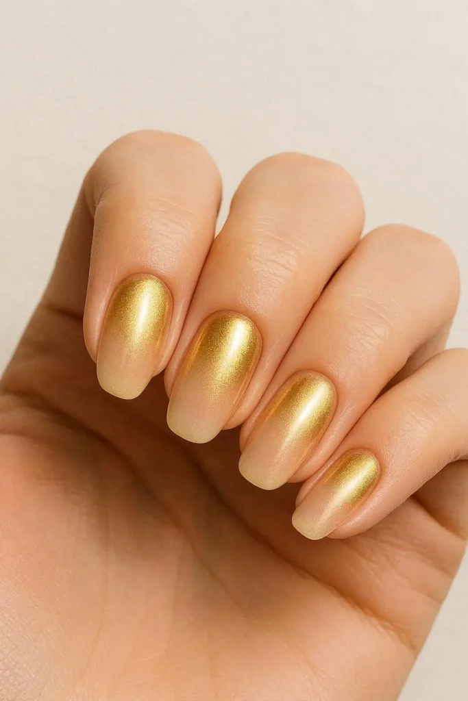 A seamless gradient that fades from deep metallic gold at the base into a soft, barely-there nude at the tip. The effect is sun-kissed and effortlessly glamorous. Works beautifully on both short and long nail shapes.