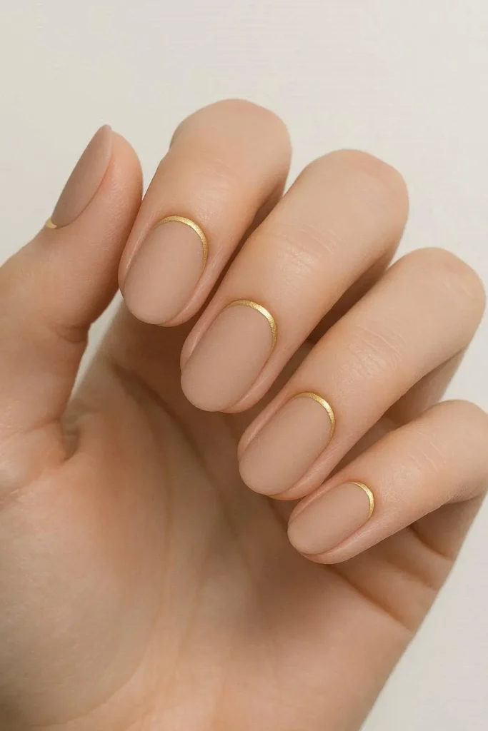 A velvety matte nude base with a fine arc of gold painted right at the cuticle line, mimicking the look of a delicate gold ring on each finger. Understated, editorial, and completely original as luxury nail designs go.