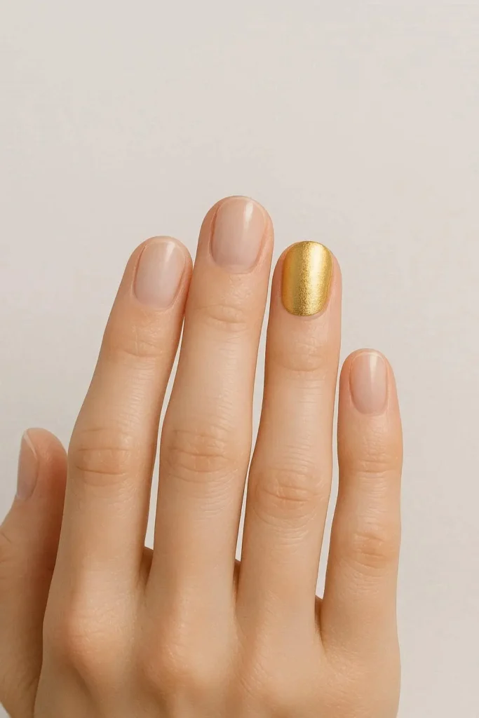 Nine bare, polished nails and one painted entirely in gold. Simple, considered, and quietly powerful. This minimalist approach to gold nails is effortless for everyday wear and works for any occasion.