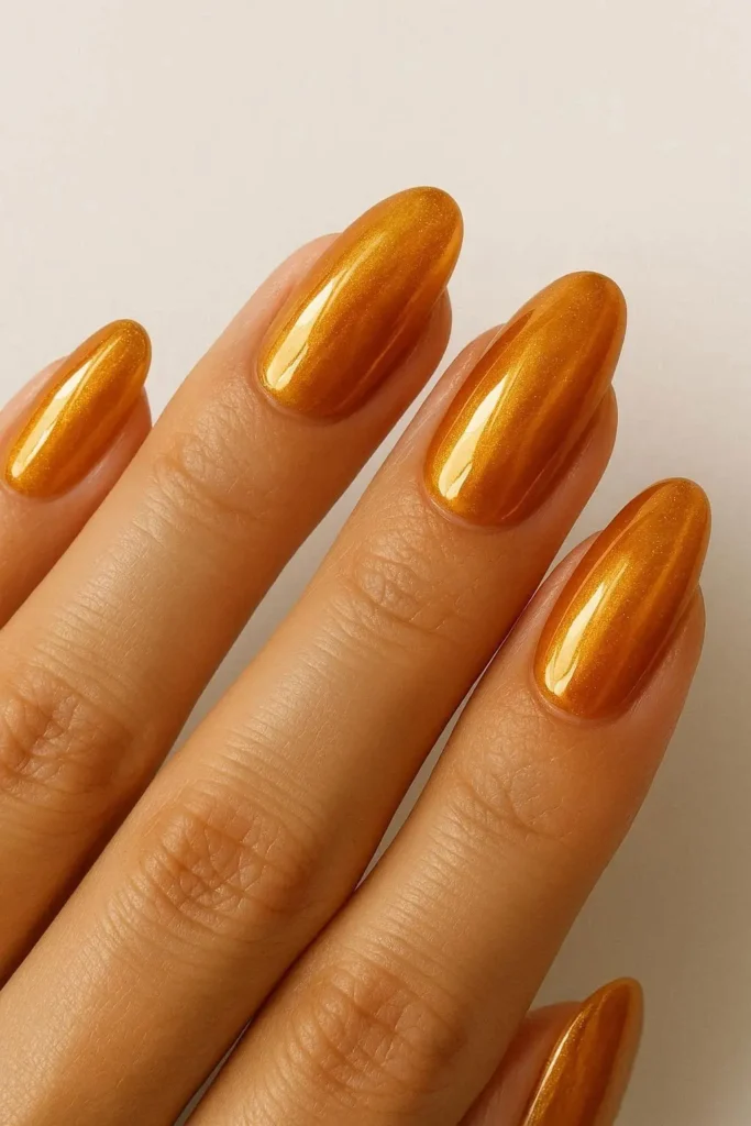 A rich, warm honey-gold gel finish that sits somewhere between metallic and jelly. It glows from within and looks stunning on medium to long oval nails. This shade flatters every skin tone beautifully.
