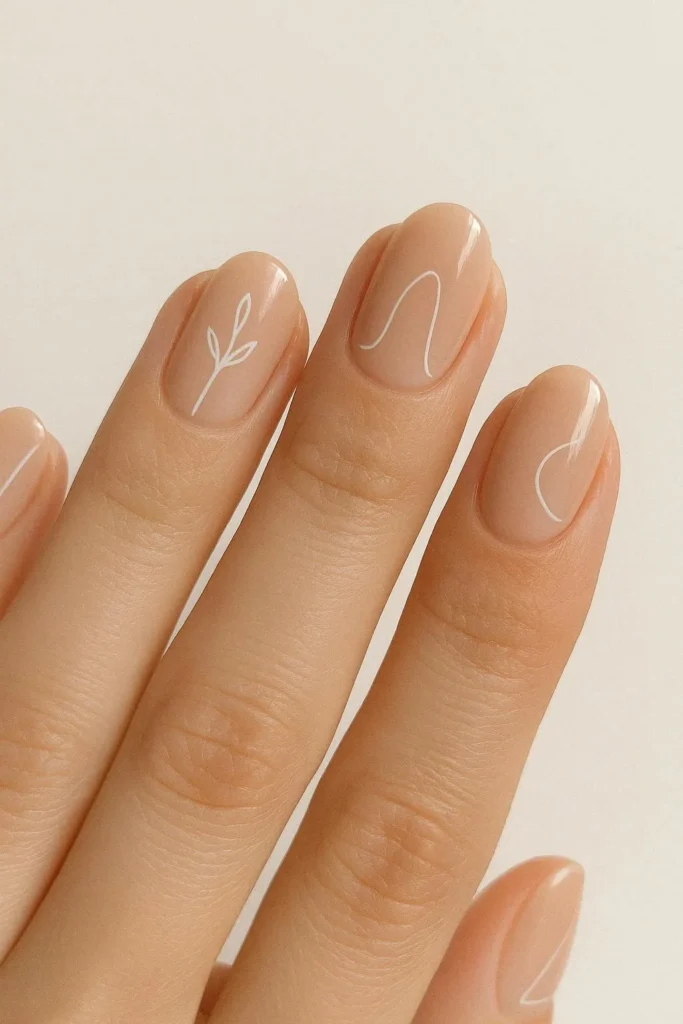 Artistic, modern, and beautifully minimal. A warm nude base with thin white line designs brings together the best of simple nail ideas and delicate nail art. Think single stems, abstract curves, or geometric shapes that look hand-drawn and completely unique.