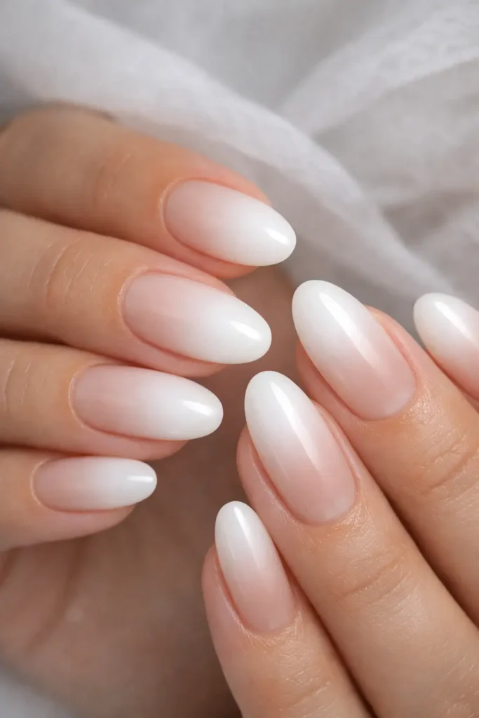 A sheer, luminous white builds up softly from the center of the nail toward the tip, creating a glowing halo effect over a translucent nude base. White glow ombre nails are clean, ethereal, and quietly stunning they feel like the nail equivalent of a lit-from-within complexion. This gradient is especially beautiful for bridal looks or minimalist nail lovers who want something just a little more elevated.